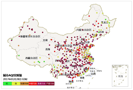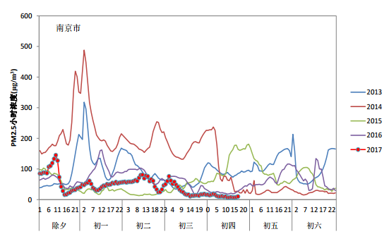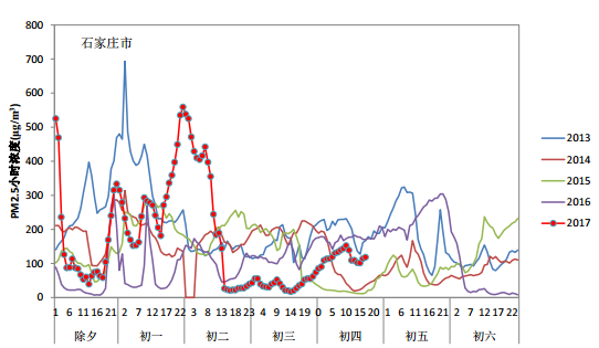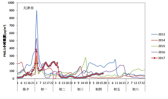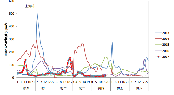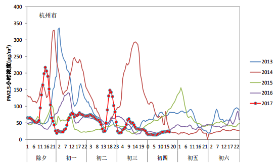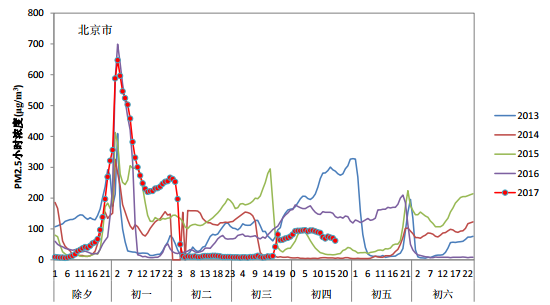 2017年除夕至初一,受烟花爆竹集中燃放影响,多数城市PM2.5浓度快速上升。除夕夜18时,全国338个地级及以上城市中仅19个城市空气质量为重度及以上污染。随后随着烟花爆竹燃放量大幅增加,多个城市空气质量快速转差两到三个级别,到初一凌晨2时,183个城市达到重度及以上污染,其中严重污染城市105个,62个城市在除夕夜间小时AQI一度超过500。全国338个城市PM2.5平均小时浓度也由18时的62微克/立方米上升到213微克/立方米。